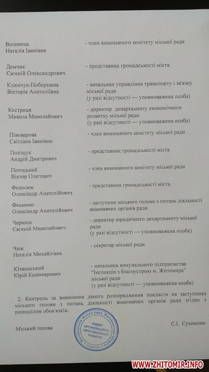 У розпорядженні Житомир.info є копія документа: робочу групу з 18 людей очолює член виконкому Руслан Годований, у її складі ще п’ять членів виконкому та чотири «представники громадськості міста»: Білобровко Ігор Миколайович, Демчик Євгеній Олександрович, Поліщук Андрій Дмитровичу та Федосюк Олександр Анатолійович.