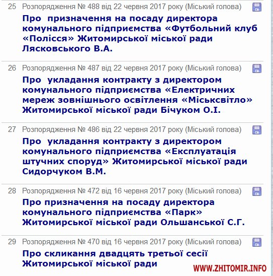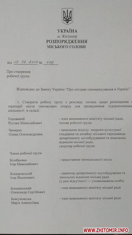«Внести зміни до розпорядження міського голови від 16.06.2017 № 476 «Про створення робочої групи», включивши до складу робочої групи з розгляду питань щодо розміщення на території міста тимчасових споруд для провадження підприємницької діяльності Романчука Олександра Володимировича — голову громадської організації «Житомирська асоціація суб'єктів малого та мікропідприємництва», - зазначається у документі, опублікованому на сайті міської ради.