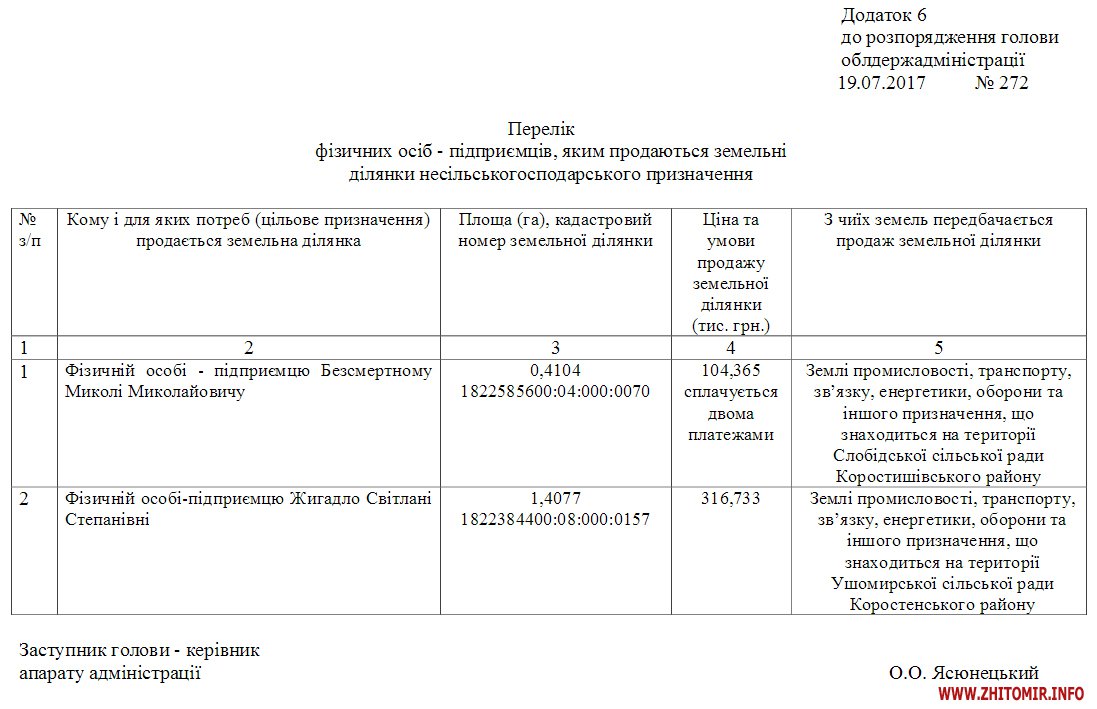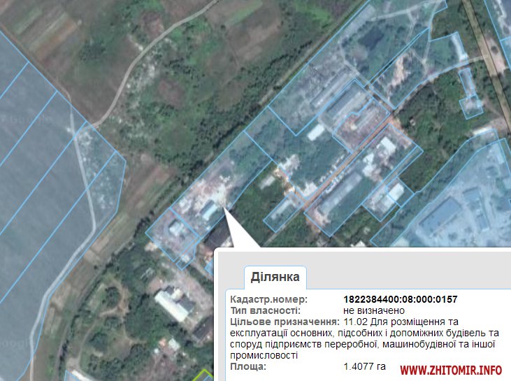 В п.5 розпорядження йдеться про погодження фізичній особі-підприємцю Жигадло Світлані Степанівні звіту про експертну грошову оцінку земельних ділянок площею 1,4077 га – землі промисловості, транспорту, зв’язку, енергетики, оборони та іншого призначення, що знаходиться на території Ушомирської сільської ради Коростенського району. Землю, яка відповідно до інформації в публічній кадастровій карті України, має невизначений тип власності, оцінили в 316 тис. 733 грн (трохи більше 12 тис. доларів).