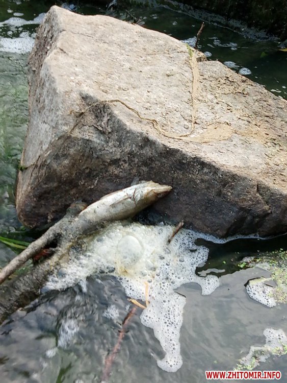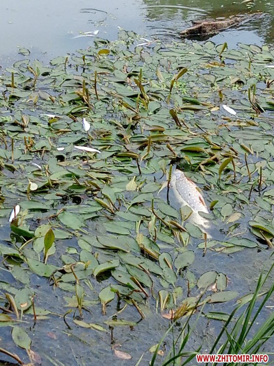 «25 липня до управління надійшло повідомлення про загибель риби на річці Тетерів, в межах м. Житомира в районі Житомирського картонного комбінату. На місце події була направлена комісія (…). Візуальним оглядом річки Тетерів встановлено, що дуже велика кількість риби знаходилась в передзаморному стані – скупчувалася в центрі річки ближче до поверхні водного шару, намагаючись споживати кисень з повітря. Вода була каламутно – сірого кольору та мала різкий неприємний специфічний запах. Також на місці події виявлено загиблу рибу, а саме: плітка, окунь, краснопірка, лящ, бичок річковий, уклія (верховодка), раки, карась, судак та щука. Деяка риба мала на животі виразки червоного кольору», - повідомляють в Держрибагентстві.