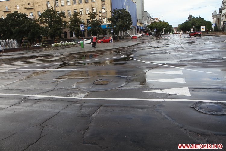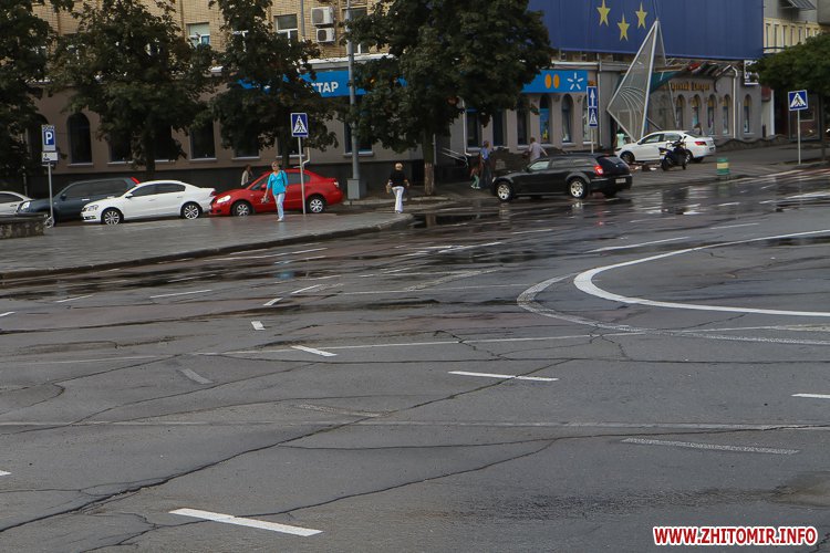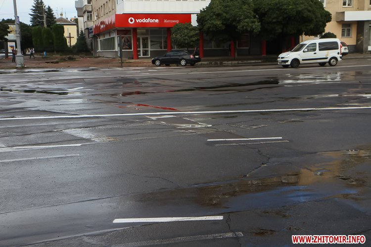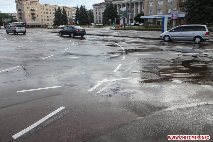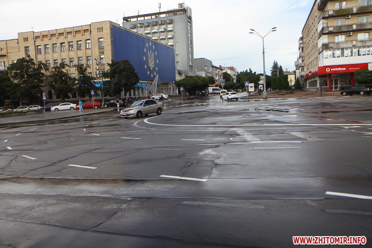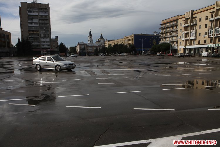 Ввечері, 21 липня, у Житомирі на майдані Соборному комунальники почали наносити нову дорожню розмітку. Працювали аж цілі вихідні, аби вже з понеділка дорогу в центрі міста можна було відкрити для руху транспорту. Під час проведення робіт, аби на перехрестя ніхто не виїжджав, стояли не лише відповідні знаки, а й поліцейські.