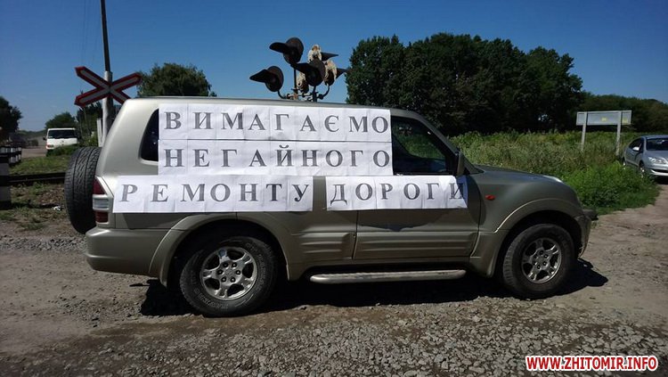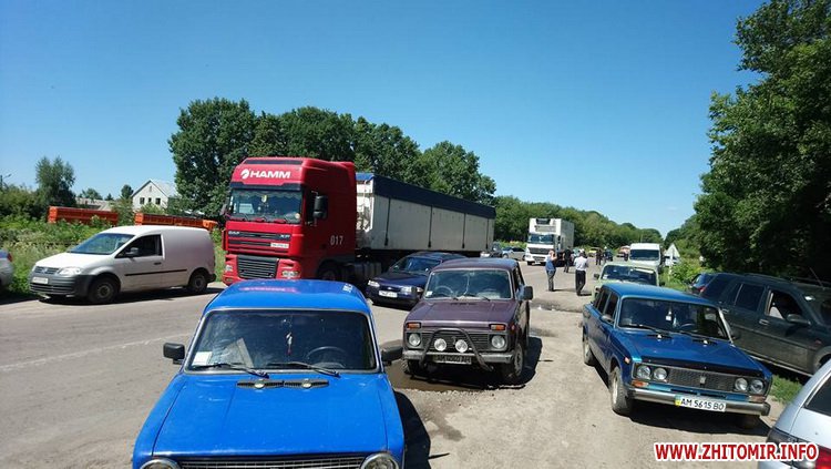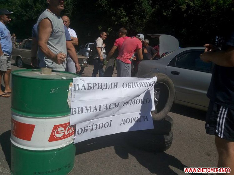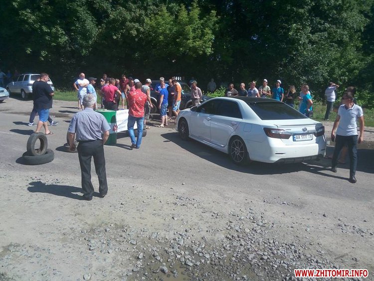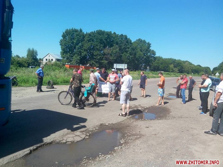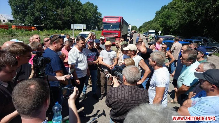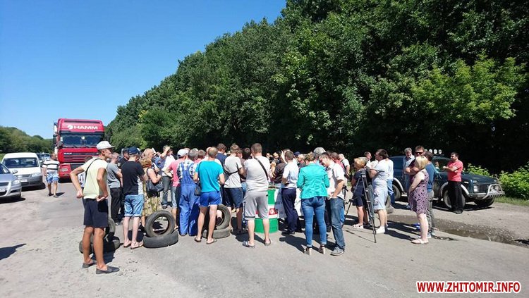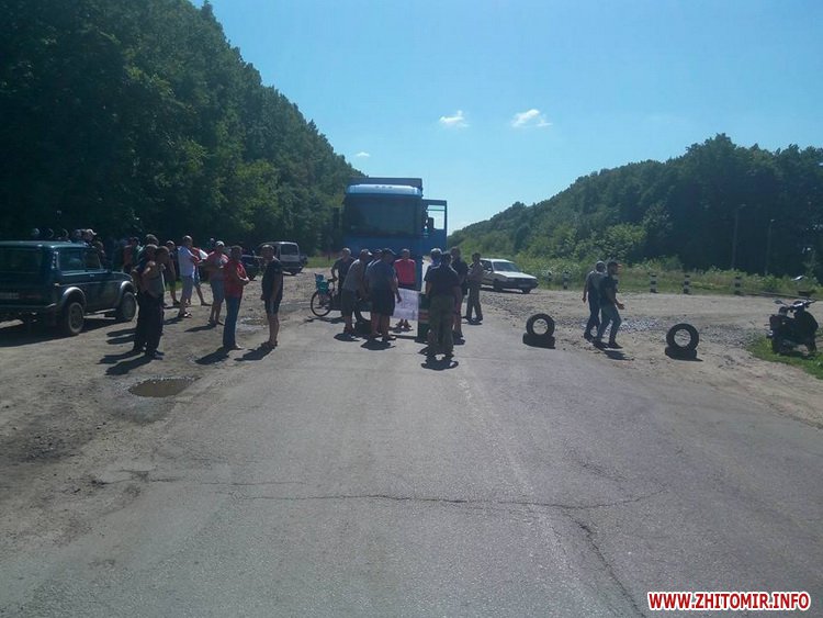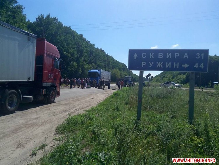 «Кілька десятків людей перекрили трасу Житомир-Сквира. Не пропускають вантажівки. Автомобілі, в яких є діти – пропускають. Люди вимагають ремонту дороги, яку вважають аварійною. На мітинг приїхали представники обласної влади. Кажуть, що ремонт цієї дороги буде коштувати близько 21 млн грн, а таких грошей немає. Вбачають вирішення цієї проблеми у співфінансуванні місцевої влади та області», - сказав журналіст Житомир.info.