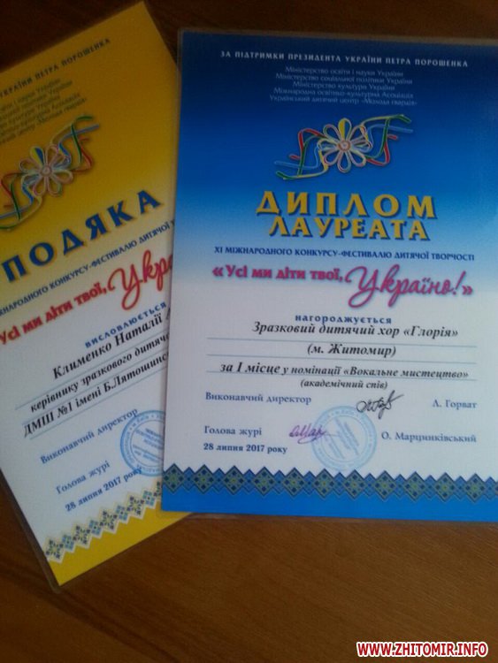 У суботу, 29 липня, колектив житомирського дитячого хору «Gloria» привіз перемогу та одержав відзнаку за перше місце на XI Міжнародному конкурсі-фестивалі дитячої творчості «Усі ми діти твої, Україно» в номінації вокальне мистецтво «Академічний спів».