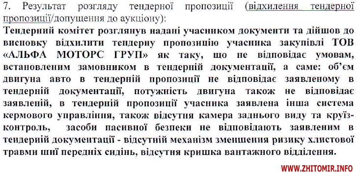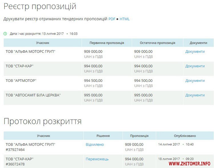 У торгах взяли участь 4 автосалони, два з яких житомирські: ТОВ «Артмотор» з міста Суми, ТОВ «Автосаміт Біла Церква» (м. Біла Церква Київської області), ТОВ «Стар-кар» та ТОВ «Альфа моторс груп» (м. Житомир).
