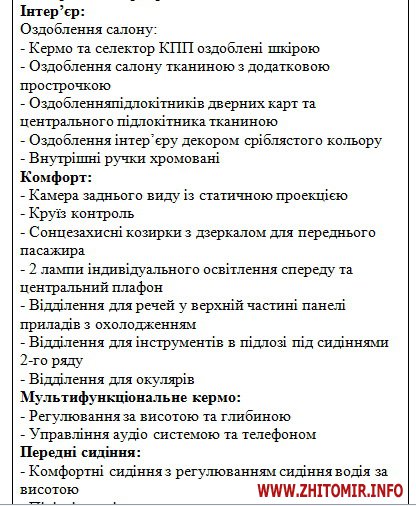 У тендерних вимогах також зазначається, що кермо та коробка передач мають бути оздоблені шкірою, а салон та підлокітники - тканиною з додатковою прострочкою. Інтер’єр автомобіля має бути оздоблений декором сріблястого кольору. Автомобіль повинен мати, зокрема, систему круїз контролю, хромовані решітку радіатора й ручки, камеру заднього виду із статичною проекцією, мультифункціональне кермо, управління аудіо системою та телефоном, підігрів сидінь, тримач для чашок, механічний кондиціонер та ряд протиугінних засобів.