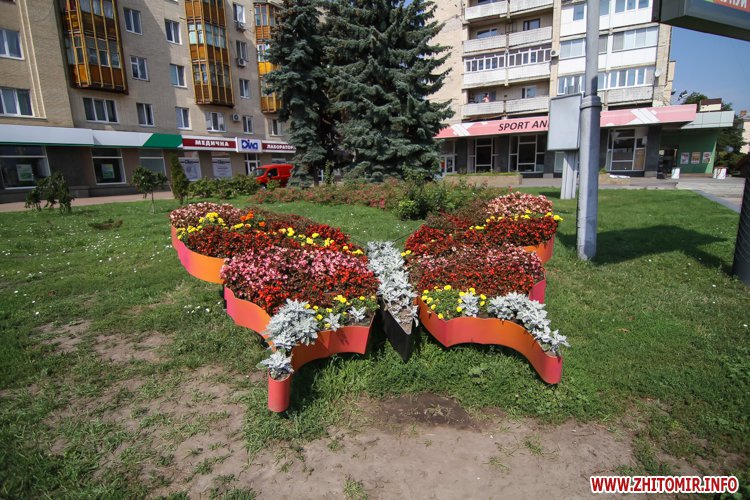 Нагадаємо, квіткову скульптура павича встановили ще в 2016 року, вона знаходиться при вході до парку культури та відпочинку ім. Ю. Гагаріна. У 2017-му на Соборному майдані житомирські комунальники встановили оригінальну клумбу-«метелик» за 14 тис. грн. Зараз там - низькорослі квіти десятка відтінків.