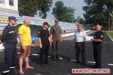 «У Коростені, на місцевому стадіоні «Спартак», проходитимуть домашні матчі футбольного клубу «Полісся» у чемпіонаті України серед команд ІІ ліги. Поліцейські, нацгвардійці, рятувальники та медики разом з працівниками стадіону та обласної федерації футболу говорили про безпеку матчів. Зокрема, оглянули спортивну споруду та допоміжні приміщення, оцінили можливості по розташуванню різних груп вболівальників, евакуації людей у разі виникнення надзвичайних ситуацій, доступу медичної допомоги тощо», - інформує поліція.