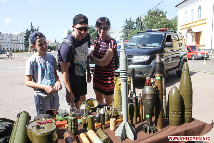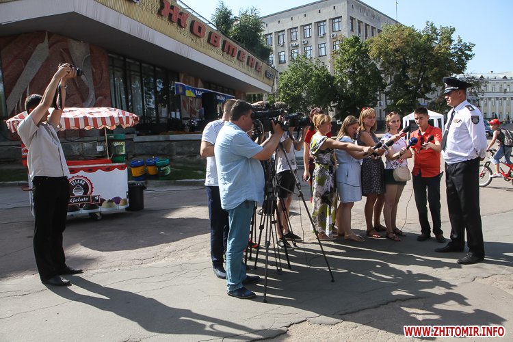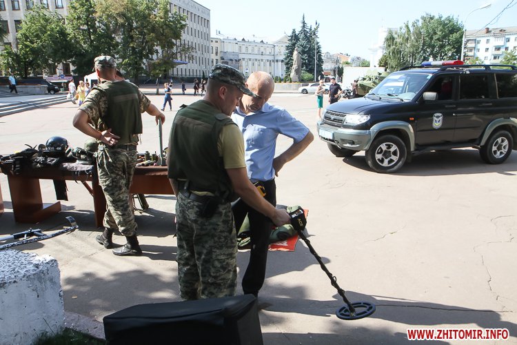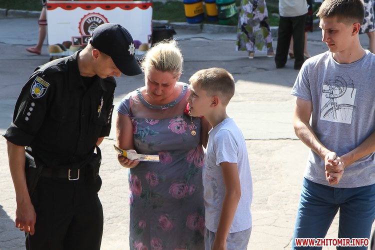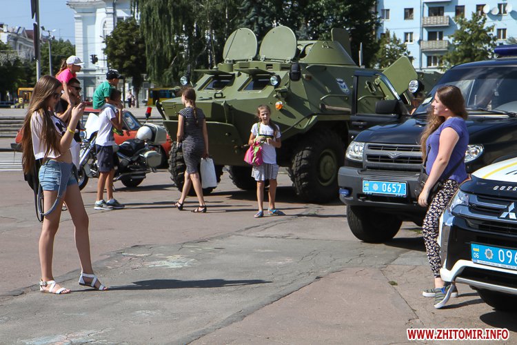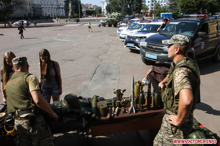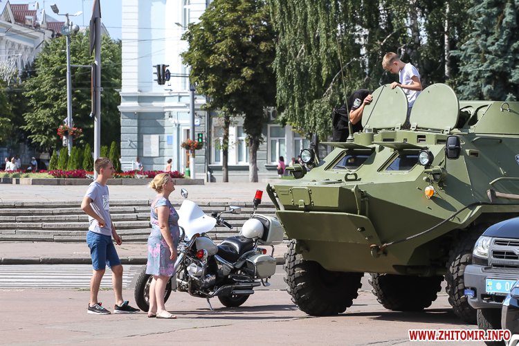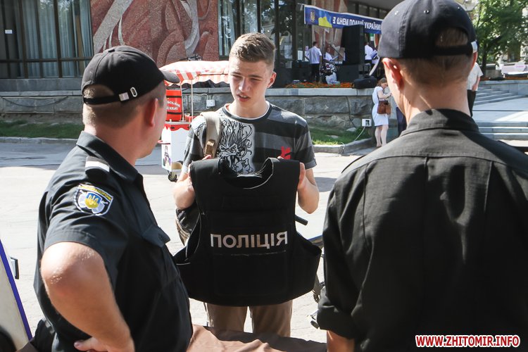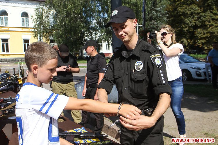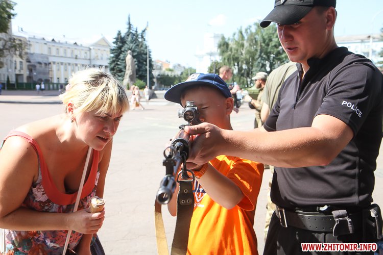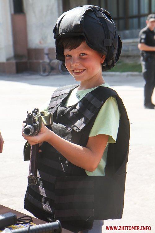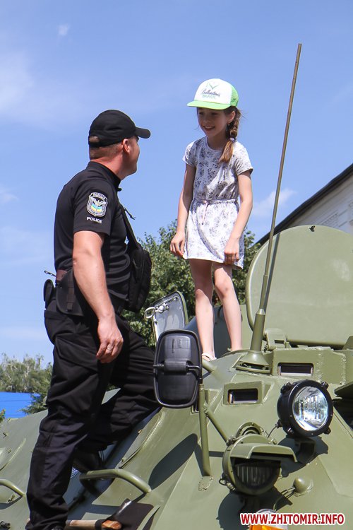 На майдані Корольова, біля кінотеатру «Жовтень» у Житомирі, правоохоронці демонструють сучасні зразки техніки, знайомлять з роботою підрозділів та навчають дітей, як поводитися у випадку виявлення підозрілих предметів. Їм також дозволяють посидіти у патрульних авто та потримати зброю. Незважаючи на спеку, є багато охочих приміряти бронежилети та шоломи.