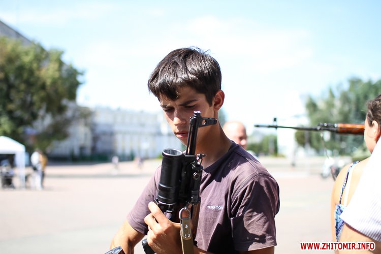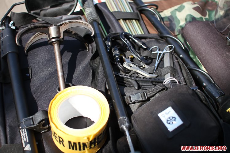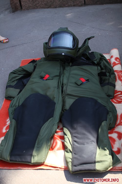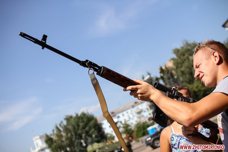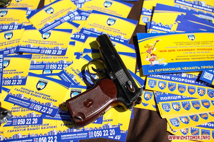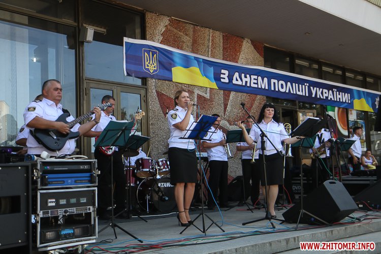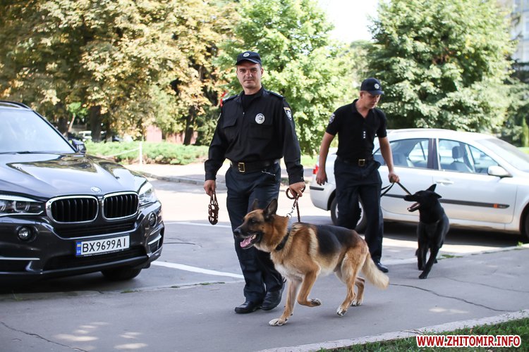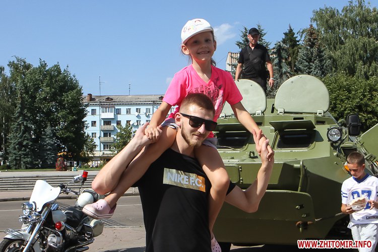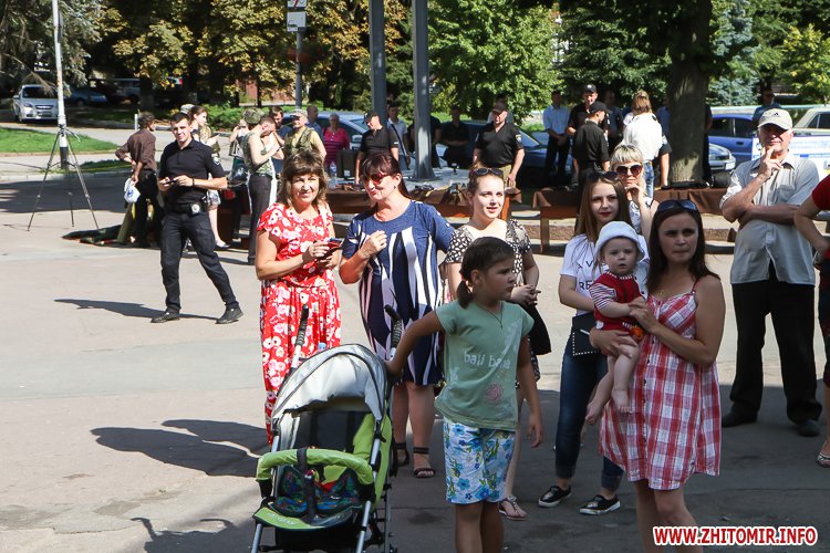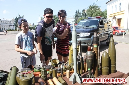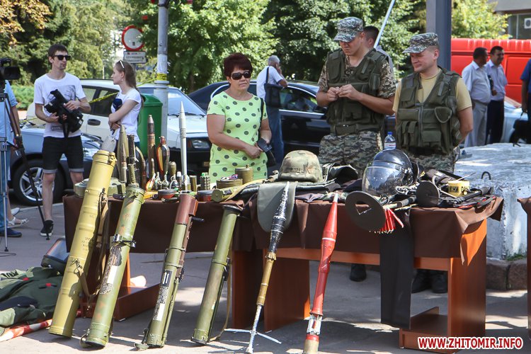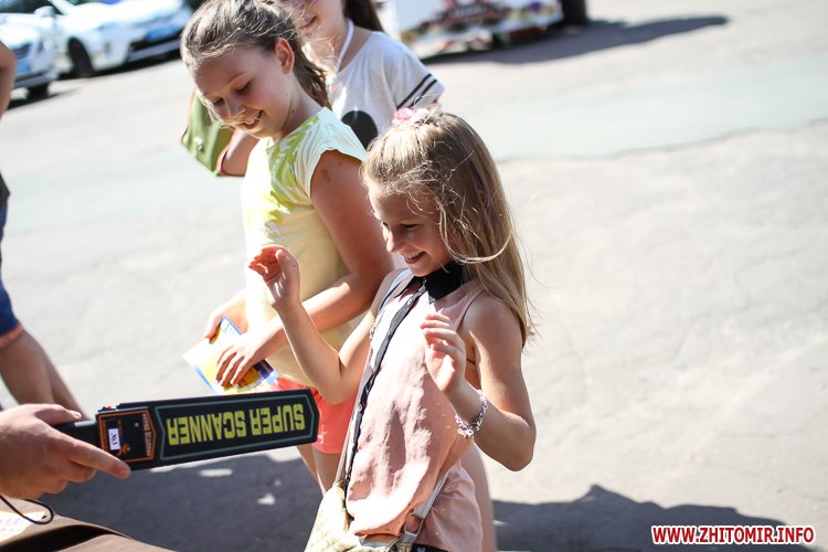 На майдані Корольова, біля кінотеатру «Жовтень» у Житомирі, правоохоронці демонструють сучасні зразки техніки, знайомлять з роботою підрозділів та навчають дітей, як поводитися у випадку виявлення підозрілих предметів. Їм також дозволяють посидіти у патрульних авто та потримати зброю. Незважаючи на спеку, є багато охочих приміряти бронежилети та шоломи.