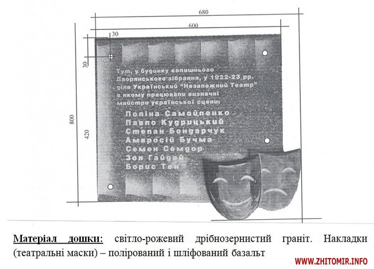 Проект рішення виконавчого комітету «Про надання згоди Житомирській обласній організації Українського товариства охорони пам’яток історії та культури на встановлення пам’ятної дошки Українському Незалежному театру у місті Житомирі» 8 серпня розмістили на сайті Житомирської міськради.