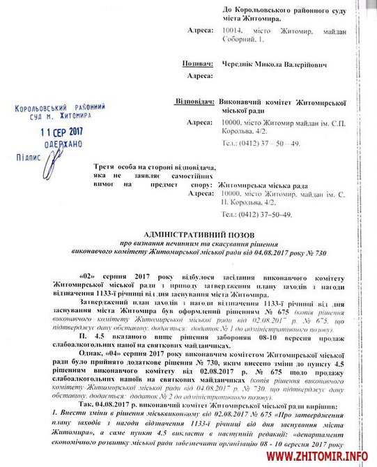 Житель Житомира Микола Череднік звернувся до Корольовського районного суду міста з позовом про визнання нечинним та скасування рішення виконкому міської ради щодо дозволу продажу слабоалкогольних напоїв на День міста.