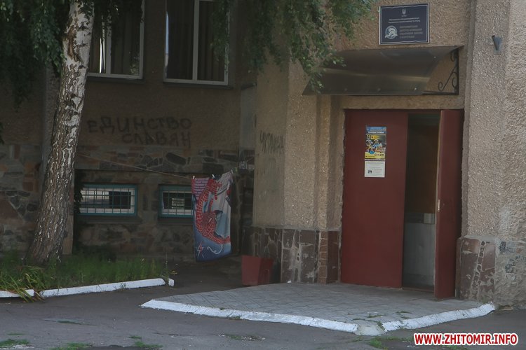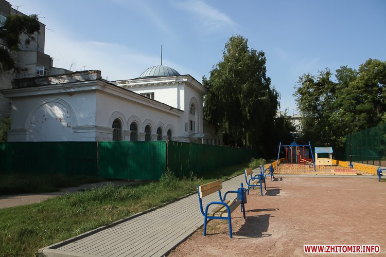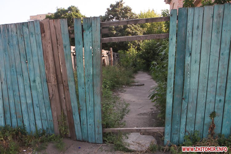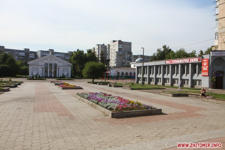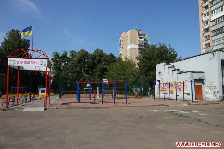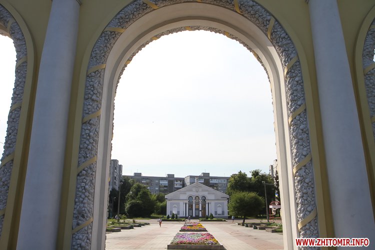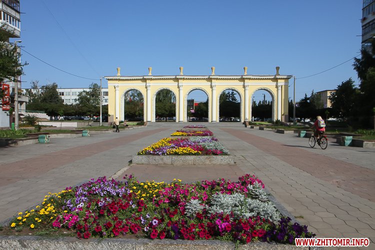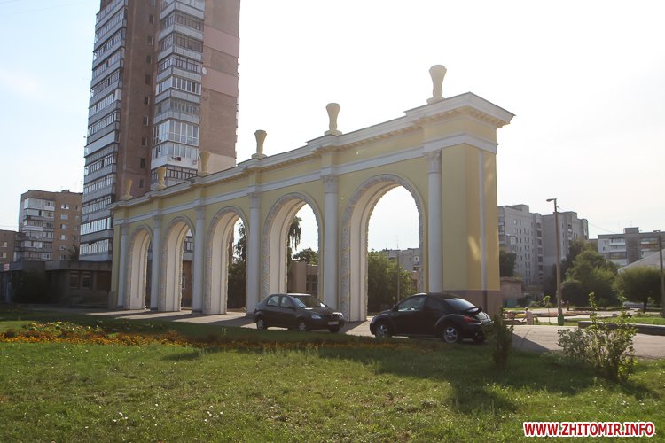 Доглянуті клумби та відреставрована арка «Мистецьких воріт» з боку Київської у Житомирі виглядають дуже презентабельно, незважаючи на декілька припаркованих авто. За «воротами» - сквер, великі клумби, сучасний спортивний майданчик та залишки старих будівель за зеленим парканом.