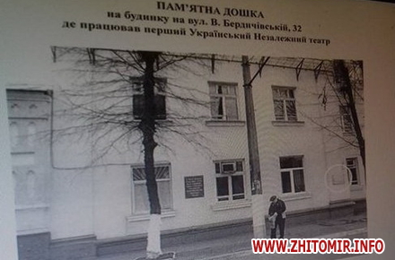 17 серпня 2017 року о 14.00 год. на будинку колишнього Дворянського зібрання (тепер поліклініка №1 на вул. Великій Бердичівській) відкриють меморіальну дошку Першому Незалежному українському театру в Житомирі.