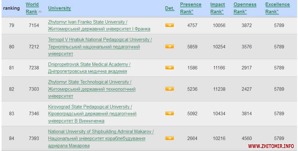 У світовому рейтингу місце ЖДУ ім. Івана Франка – 7154, ЖДТУ – 7303, ЖНАЕУ – 9757.