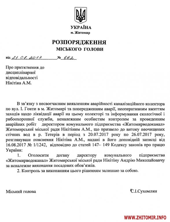 «В зв’язку з несвоєчасним виявленням аварійності каналізаційного колектора по вул. І Гонти в м.Житомира та попередженням аварії, неоперативним вжиттям заходів щодо ліквідації аварії на цьому колекторі та інформування екологічної і рибоохоронної служби, неналежним особистим контролем за проведенням аварійних робіт директором комунального підприємства «Житомирводоканал» Житомирської міської ради Нікітіним А.М., що призвело до витоку неочищених стічних вод в р.Тетерів в період з 20.07.2017 року по 26.07.2017 року», - так у документі визначена причина догани.