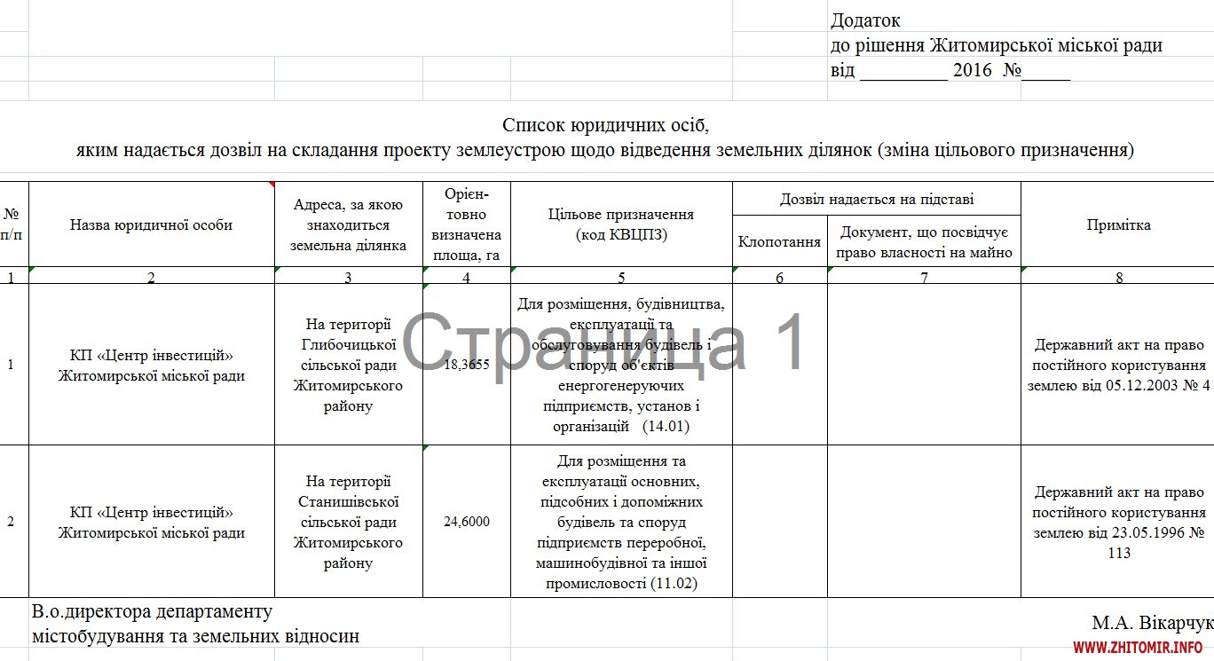 Земельні ділянки КП «Центр інвестицій» отримає у користування від попередніх власників – КП «Зеленбуд» та КП «Житомирбудзамовник». Відповідний проект рішення сесії також 21 серпня опублікований на сайті міськради.