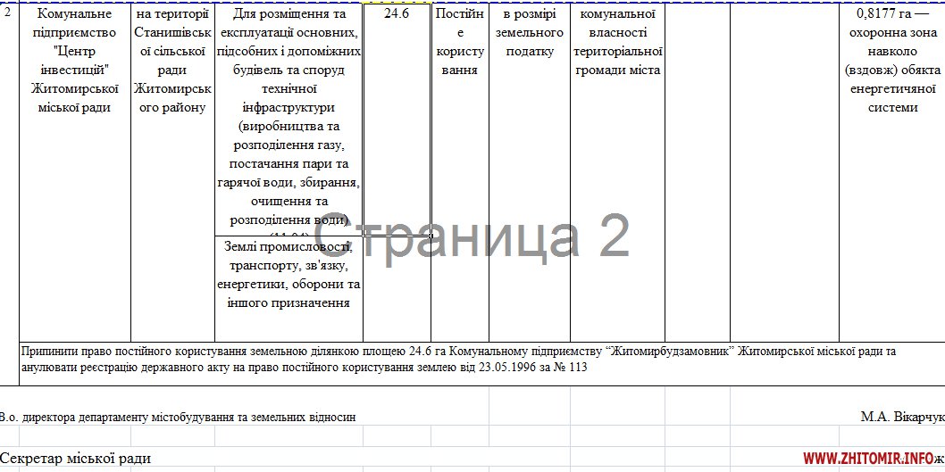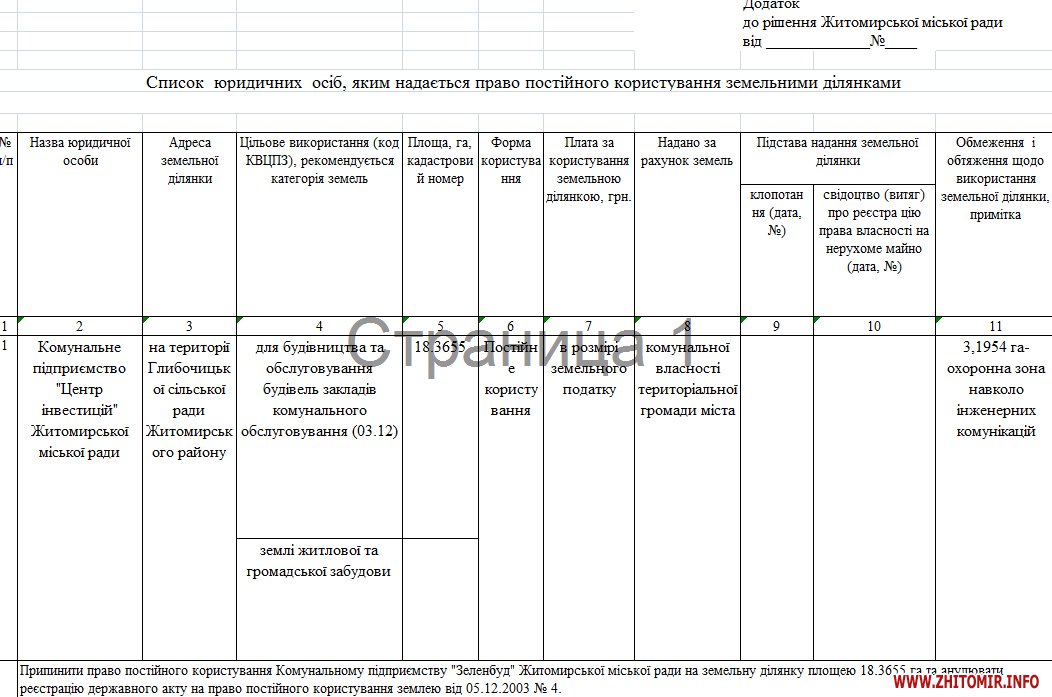 «Припинити право постійного користування, внести відомості про це до єдиного реєстру прав на нерухоме майно та надати у постійне користування земельні ділянки підприємствам комунальної форми власності відповідно до додатку. Пункт 2 додатку до цього рішення набирає законної сили лише після взяття на баланс КП «Центр інвестицій» Житомирської міської ради об’єктів нерухомого майна, що розташовані на земельній ділянці. Суб'єктам земельних відносин (землекористувачам) відповідно до вимог чинного законодавства України привести у відповідність до даного рішення правовстановлюючі документи на земельні ділянки», - наголошується у проекті рішення.