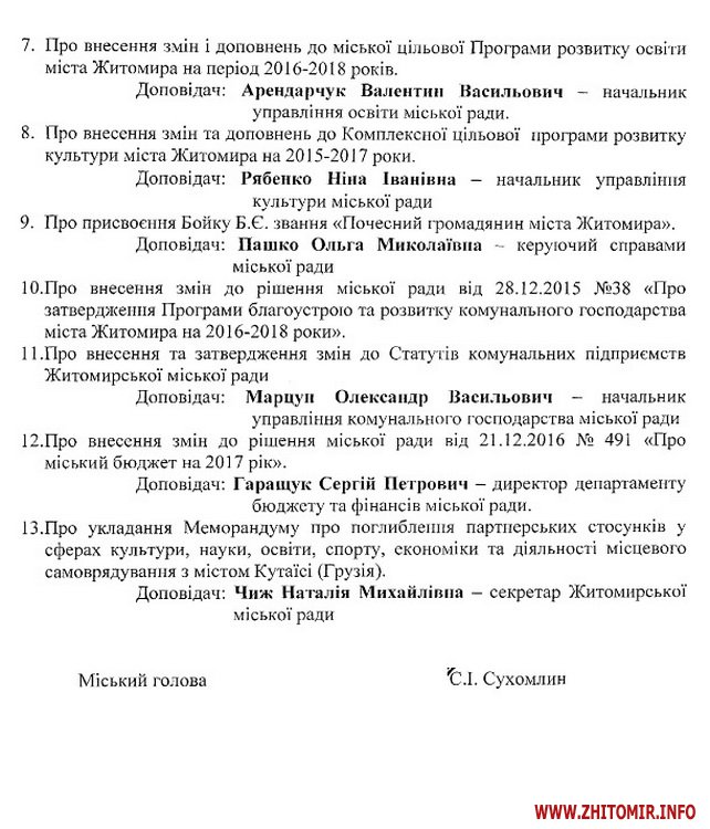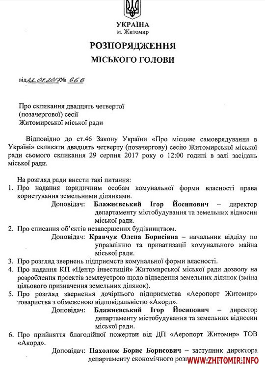 «Відповідно до ст..46 Закону України «Про місцеве самоврядування в Україні» скликати 24 (позачергову) сесію Житомирської міської ради сьомого скликання на 29 серпня 2017 року о 12:00 годині в залі засідань міської ради», - йдеться у розпорядженні.