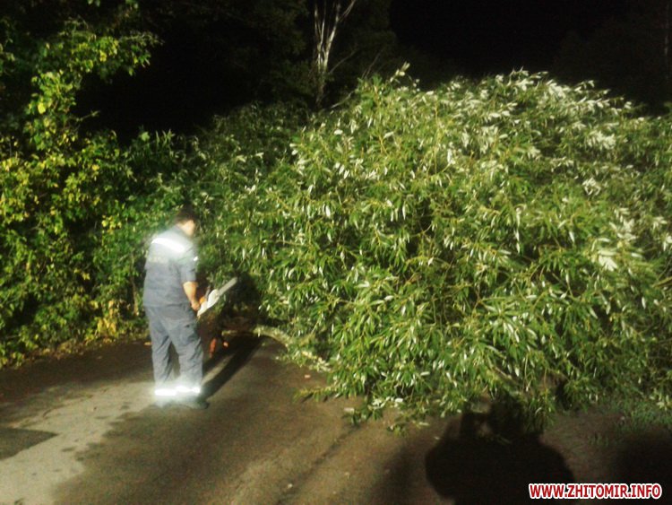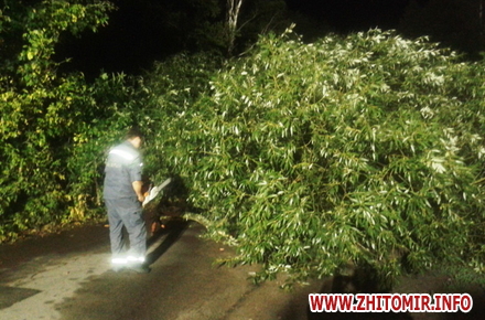 Як повідомляв Житомир.info, після негоди, 13 липня, рятувальники прибирали дерево, яке впало на дах будинку в Баранівці та порізали тополю, яка перекрила рух транспорту в Пулинському районі.