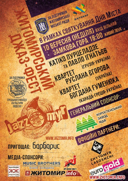 Слоган нашого фестивалю «Джаз єднає нас!», адже в усьому світі джазова музика гуртує креативних людей з ліберальними поглядами, дружелюбних та естетично вибагливих. Ось чому житомирський джаз-фест Jazzomyr без сумнівів є івентом, що наближує Житомир до статусу модерного європейського міста.