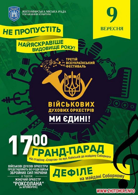 «З Днем народження нашого славного міста Житомира їдуть вітати Київ, Одеса, Львів, Кременчук, Вінниця, Чернігів! Зустрічайте - Третій всеукраїнський фестиваль - дефіле військових духових оркестрів всіх родів військ Збройних сил України – 14 оркестрів, 526 військових, 526 музичних інструментів! 9 вересня о 17.00 годині відбудеться гранд-парад військових духових оркестрів від стадіону «Спартак» до майдану Соборного», - розповіли в управлінні культури.