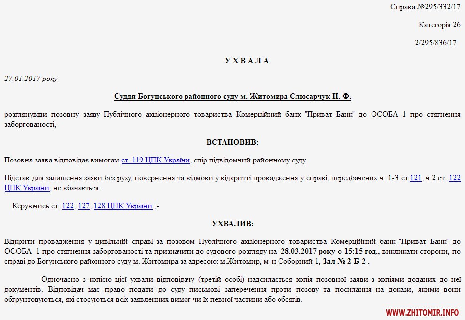 У Богунському райсуді 4 жовтня відбудеться судове засідання у цивільній справі за позовом ПАТ «Приватбанк» до заступника мера Олександра Фещенка щодо стягнення заборгованості. В декларації Фещенка за 2016 рік відсутня будь-яка інформація про кредити чи вклади у Приватбанку.