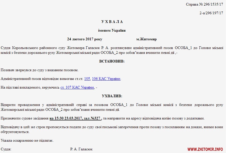 Корольовський районний суд 2 жовтня розглядатиме адміністративну справу за позовом Ващука Юрія Павловича, де відповідачем виступає голова міської комісії з безпеки дорожнього руху Житомирської міської ради Ткачук Дмитро Григорович – заступник мера.