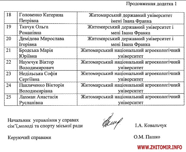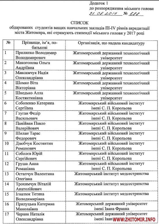 «Управлінню у справах сім’ї, молоді і спорту міської ради провести до 20 вересня 2017 року виплату 25 стипендій міського голови обдарованим студентам вищих навчальних закладів ІІІ-ІV рівнів акредитації м.Житомира у 2017 році згідно з додатком 1 та кошторисом», - зазначається у документі.