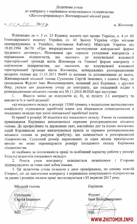 Розпорядження про укладання додаткової угоди до контракту з директором КП «Житомиртранспорт» мер Сергій Сухомлин підписав 1 вересня.