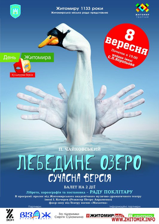 До 1133-річчя Житомира глядачі побачать сучасну постановку «Лебединого озера» всесвітньовідомого балетмейстера Раду Поклітару: організатори обіцяють фантастичні декорації, цікаві костюми, незвичні образи артистів та містичного лебедя. Також в програмі заходу пролог від Житомирського академічного музично-драматичного театру імені І. Кочерги (режисер постановник – Петро Авраменко). Завершить «Культурну версію» фаєр-шоу від театру вогню «Махатма».