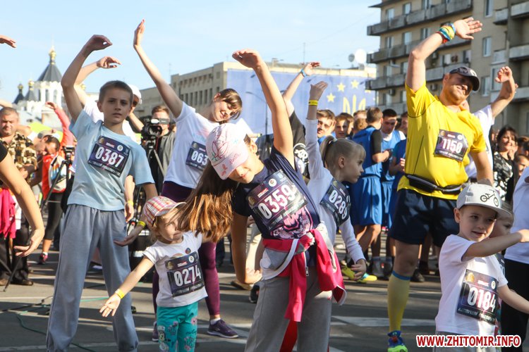 Зі сцени учасників забігів привітали мер Житомира Сергій Сухомлин та віце-прем’єр-міністр, житомирянини Геннадій Зубко. На Космомарафон приїхав й перший український космонавт Леонід Каденюк.Потім була традиційна зарядка-розминка для учасників забігів.