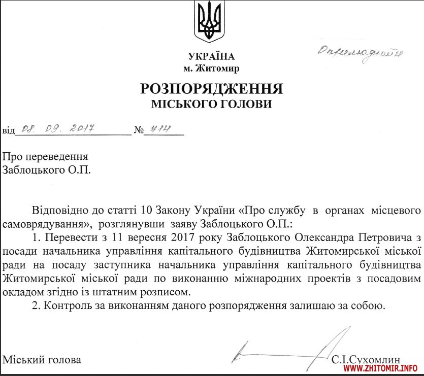 «Перевести з 11 вересня 2017 року Заблоцького Олександра Петровича з посади начальника управління капітального будівництва Житомирської міської ради на посаду заступника начальника управління капітального будівництва Житомирської міської ради по виконанню міжнародних проектів з посадовим окладом згідно із штатним розписом», – йдеться у розпорядженні.