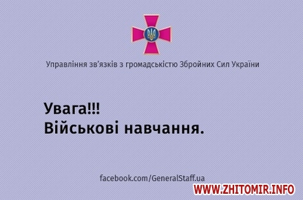 На території трьох областей Рівненської, Волинської та Житомирської військові розпочинають масштабні навчання. На Житомирщині навчання проводитимуть в Олевському, Овруцькому, Ємільчинському, Лугинському, Народицькому, Коростенському та Малинському районах. Військові попереджають, що фото та відео зйомка військової техніки і режимних об’єктів заборонена та обіцяють збивати безпілотники.