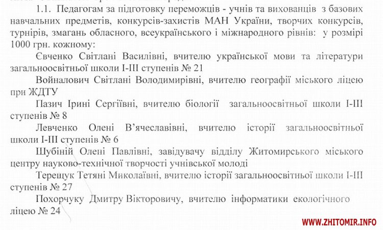 Мер Житомира розпорядився призначити та виплатити премій міського голови педагогічним працівникам та керівникам дошкільних, загальноосвітніх, позашкільних навчальних закладів міста.