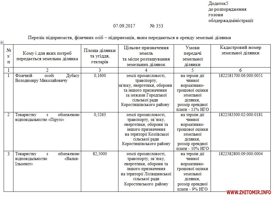 У згаданому додатку серед шести підприємств є товариство з обмеженою відповідальністю «Валки-Ільменіт», якому надається 82,5 га землі промисловості, транспорту, зв’язку, енергетики, оборони та іншого призначення на території Лісівщинської сільської ради Коростенського району «на термін дії чинної нормативно-грошової оцінки земельної ділянки». Розмір орендної плати – 9% нормативно-грошової оцінки землі.