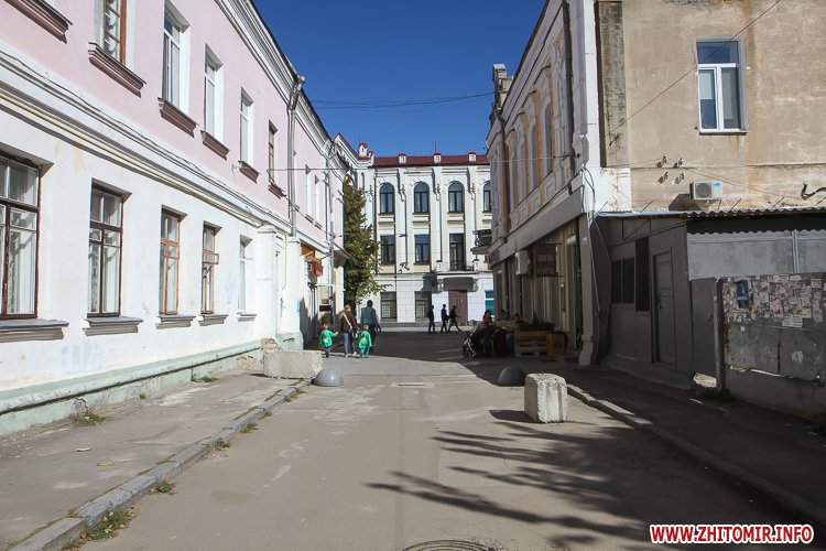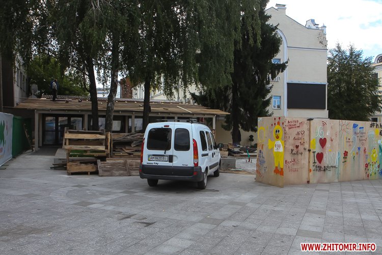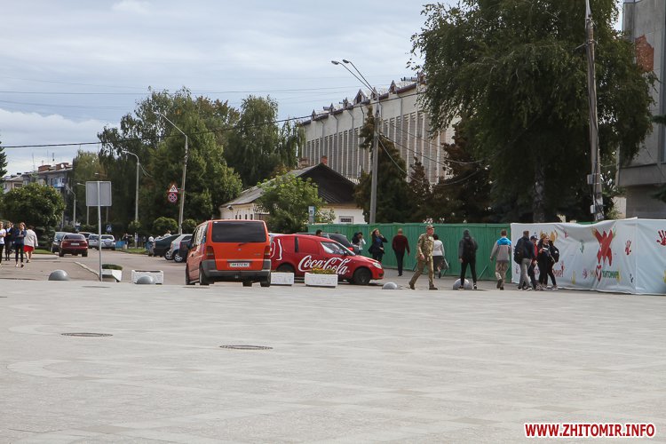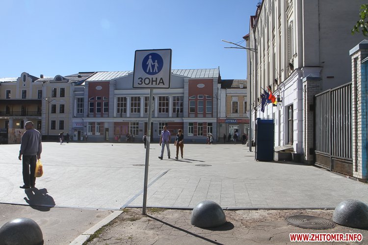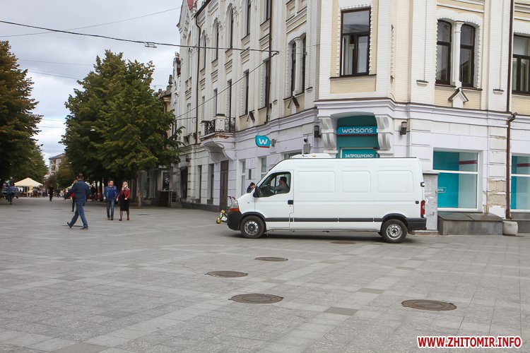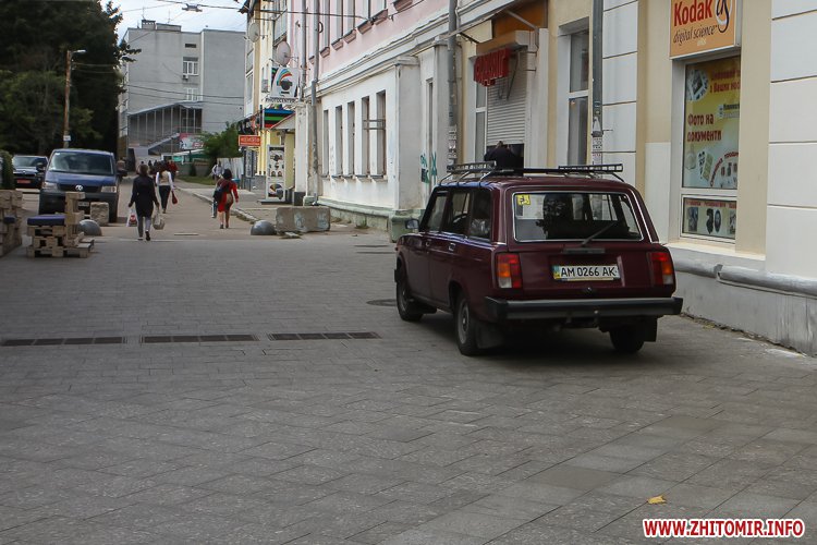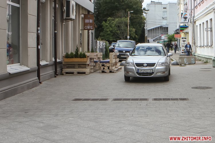 Нагадаємо, зі сторони вулиць Київська та Велика Бердичівська встановлені боларди та гранітні півкулі, тому заїхати звідти важкувато. Але, на плитці зі сторони Київської все ж були припарковані машини. Зі сторони провулку Скорульського та вулиці Лятошинського проїзд перегороджують лише півкулі, які просто розсовують та звільняють проїзд.