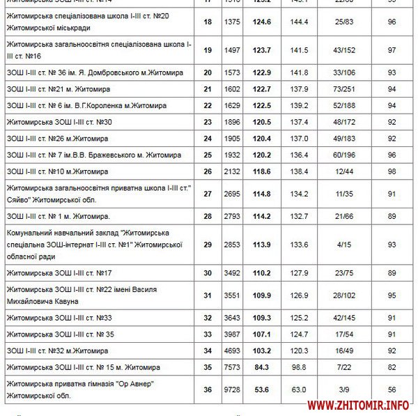 Рейтинг загальноосвітніх шкіл Житомира, що посіли найвищі місця у рейтингу шкіл України за підсумками ЗНО 2017 року, опублікований на інформаційному освітньому ресурсі «Освіта.ua».