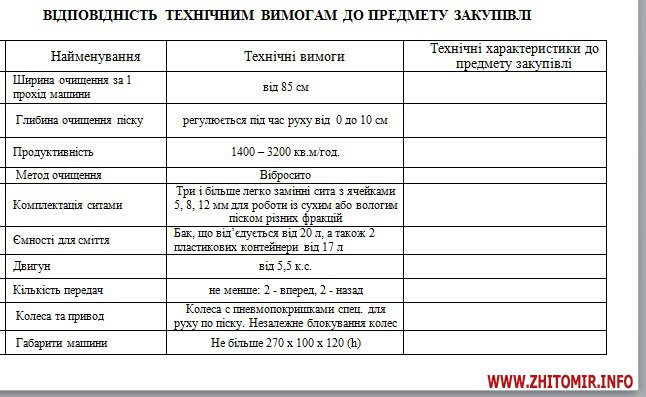 Комунальне підприємство «Парк» Житомирської міської ради хоче за 300 тисяч гривень купити ручну машину для прибирання пляжів. Інформацію про початок відкритих торгів на ProZorro розмістили 12 вересня. Кінцевий строк подання пропозицій 28 вересня. Поставити товар майбутній переможець тендеру повинен до 31 жовтня.