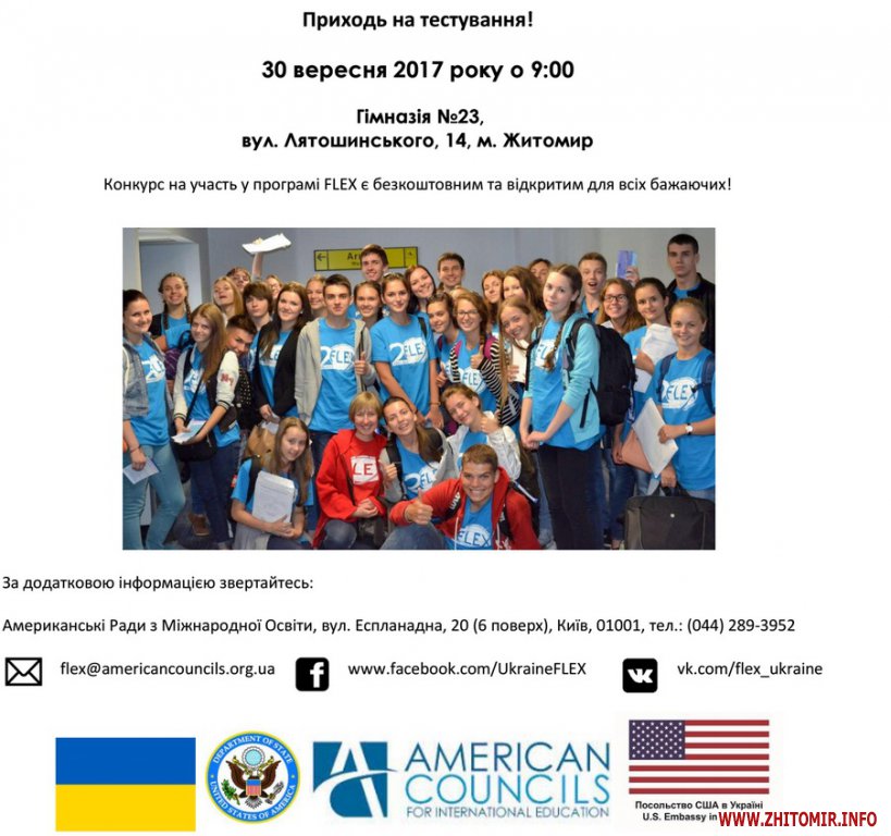 30 вересня 2017 року о 9:00 у приміщенні житомирської гімназії №23 (вул. Лятошинського, 14) старшокласники можуть скласти тести з англійської мови та цілий рік безкоштовно жити і навчатися у США.