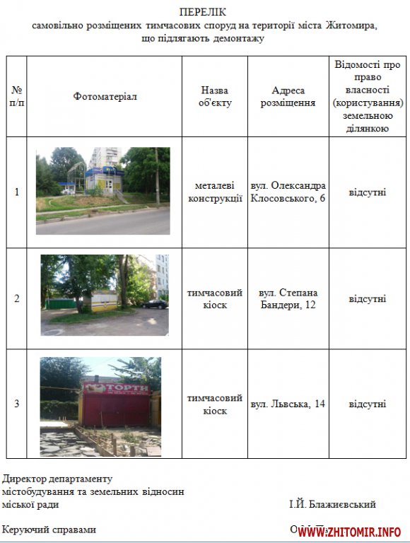 «Затвердити перелік самовільно розміщених тимчасових споруд, що підлягають демонтажу згідно з додатком. У разі виявлення самовільного розміщення на турнікетах/парканах банерів, ці засоби зовнішньої реклами визнавати такими, що підлягають негайному демонтажу. Зобов'язати комунальне підприємство «Інспекція з благоустрою м. Житомира» Житомирської міської ради в місячний термін демонтувати тимчасові споруди згідно з додатком та виконувати роботи з демонтажу банерів на турнікетах/парканах», - йдеться у затвердженому рішенні.
