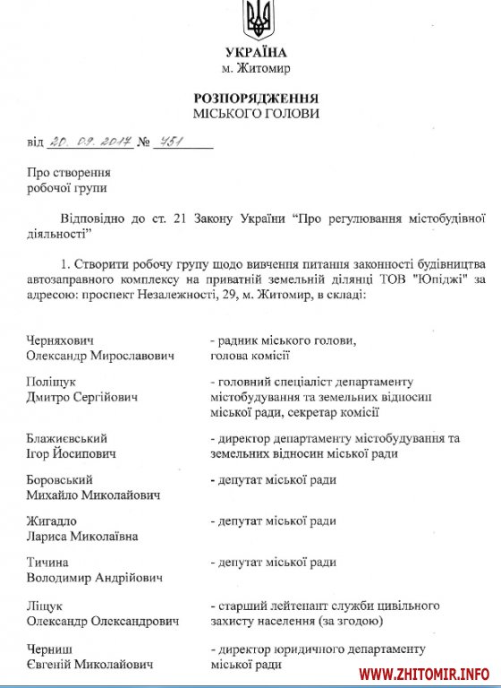 4 вересня в міськраді відбулось засідання робочої групи, яка вивчає законність будівництва автозаправки на проспекті Незалежності, але Розпорядження «Про створення робочої групи» щодо законності будівництва автозаправного комплексу на приватній земельній ділянці ТОВ «Юпіджі» за адресою: проспект Незалежності, 29 в Житомирі міський голова підписав тільки 15 вересня. 18 вересня радник мера Олександр Черняхович повідомив, що робочу групу, створену розпорядженням від 15 вересня, розпустили, бо мешканці звернулися до суду.