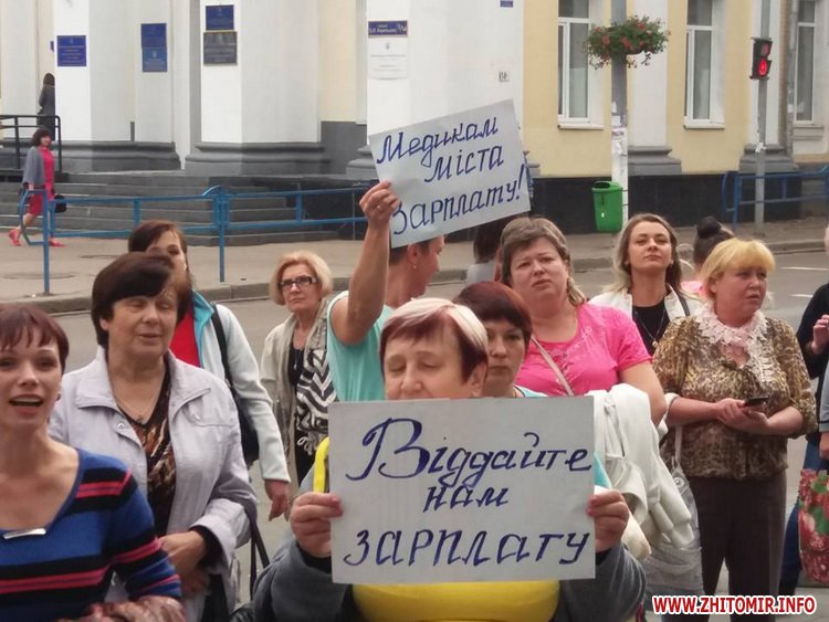 «Медики з міських лікарень пікетують мерію та вимагають виплатити їм заборгованість по зарплаті. Медпрацівники кажуть: їм немає за що кормити сім'ї. Наразі мітингувальників запросили до сесійної зали міськради», - повідомляє журналіст Житомир.info.