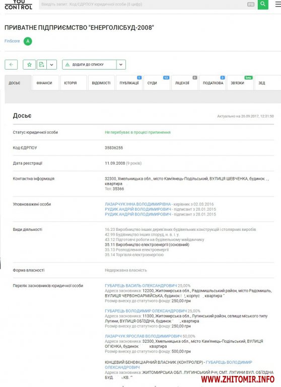 Лазарчук Ярослав Володимирович є засновником кількох підприємств з пропискою у місті Кам’янці-Подільському Хмельницької області. Зокрема й ПП «Енерголісбуд – 2008», співзасновниками якого є жителі Житомирської області – Володимир та Василь Губарці.
