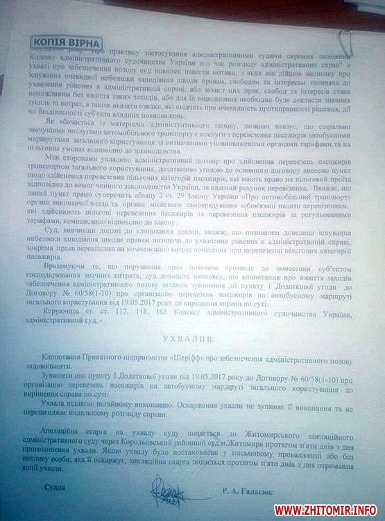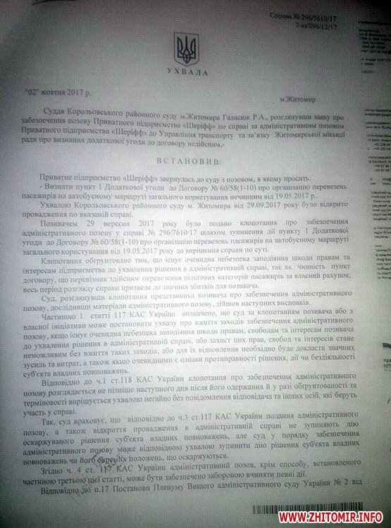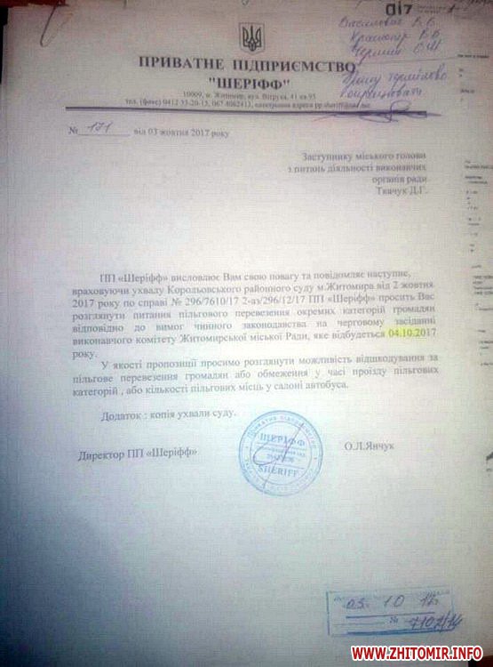 «ПП «Шеріфф» висловлює вам свою повагу та повідомляє наступне. Враховуючи ухвалу Корольовського районного суду м. Житомира від 2 жовтня по справі №296…, ПП «Шеріфф» просить Вас розглянути питання пільгового перевезення окремих категорій громадян відповідно до вимог чинного законодавства на черговому засіданні виконавчого комітету Житомирської міської ради, яке відбудеться 4 жовтня 2017 року. У якості пропозиції просимо розглянути можливість відшкодування за пільгове перевезення громадян або обмеження у часі проїзду пільгових категорій, або кількості пільгових місць у салоні автобуса».