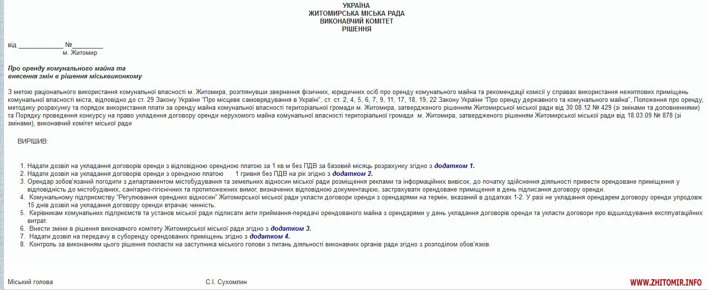 Про це йдеться в додатку до проекту рішення виконавчого комітету «Про оренду комунального майна та внесення змін в рішення міськвиконкому», який з’явився на сайті Житомирської міської ради 5 жовтня.