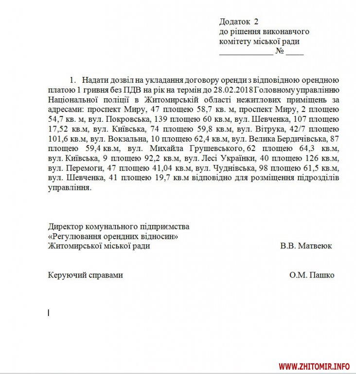 «Надати дозвіл на укладання договору оренди з відповідною орендною платою 1 гривня без ПДВ на рік на термін до 28.02.2018 Головному управлінню Національної поліції в Житомирській області нежитлових приміщень за адресами: проспект Миру, 47 площею 58,7 кв. м, проспект Миру, 2 площею 54,7 кв. м, вул. Покровська, 139 площею 60 кв.м, вул. Шевченка, 107 площею 17,52 кв.м, вул. Київська, 74 площею 59,8 кв.м, вул. Вітрука, 42/7 площею 101,6 кв.м, вул. Вокзальна, 10 площею 62,4 кв.м, вул. Велика Бердичівська, 87 площею 59,4 кв.м, вул. Михайла Грушевського, 62 площею 64,3 кв.м, вул. Київська, 9 площею 92,2 кв.м, вул. Лесі Українки, 40 площею 126 кв.м, вул. Перемоги, 47 площею 41,04 кв.м, вул. Чуднівська, 98 площею 61,5 кв.м, вул. Шевченка, 41 площею 19,7 кв.м відповідно для розміщення підрозділів управління», – йдеться у документі.