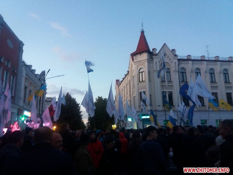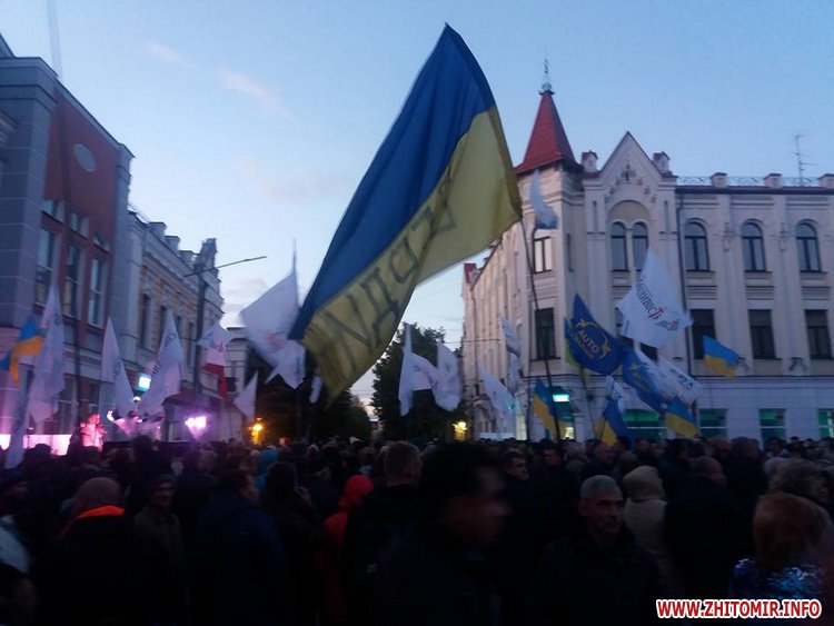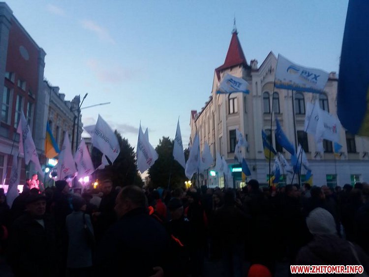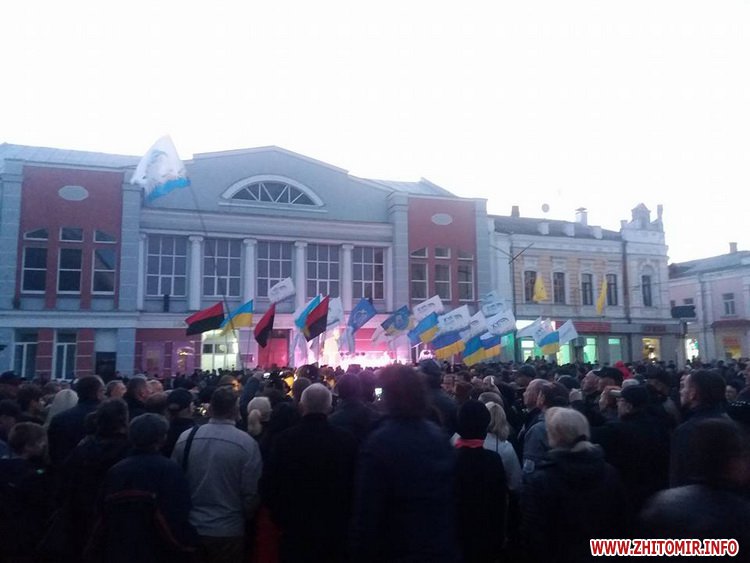 На зустріч прийшли кілька сотень житомирян. Учасники зібрання тримають синьо-жовті державні та червоно-чорні прапори ОУН, стяги політичних сил «Рух нових сил» та «Справедливість», а також «Громадянська позиція».