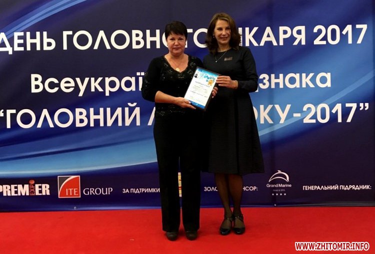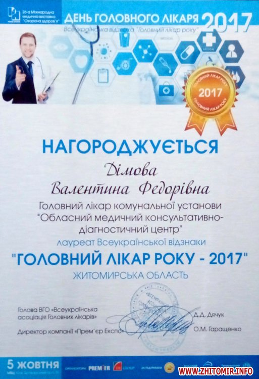 Головний лікар комунальної установи «Обласний медичний консультативно-діагностичний центр» Житомирської обласної ради Валентина Дімова отримала Всеукраїнську відзнаку «Головний лікар року - 2017».