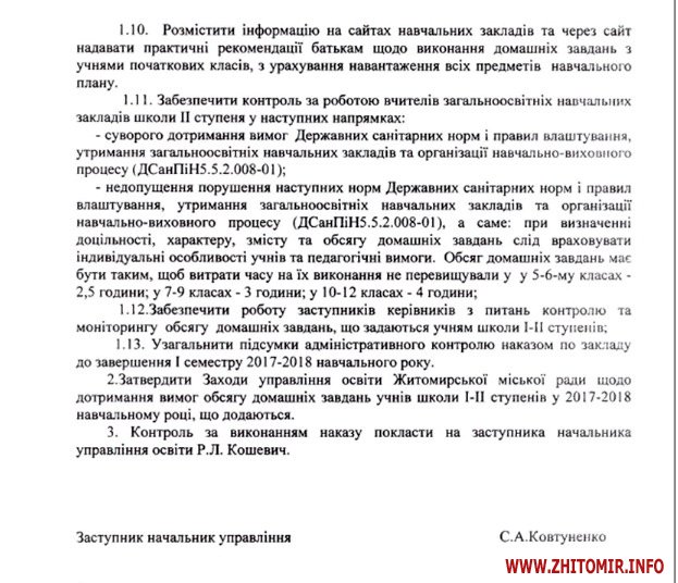 До свого матеріалу він прикріпив список заходів управління освіти Житомирської міської ради щодо дотримання вимог обсягу домашніх завдань учнів школи І-ІІ ступенів у 2017-2018 навчальному році та наказ управління освіти Житомирської міської ради від 4 жовтня 2017 року «Про дотримання вимог щодо обсягу домашніх завдань учнів загальноосвітніх навчальних закладів м. Житомира» за підписом заступника начальника управління освіти міськради Світлани Ковтуненко.