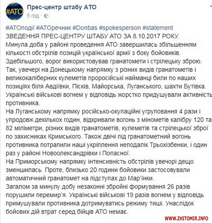 За інформацією прес-центру штабу АТО, 8 жовтня унаслідок бойових дій втрат серед бійців АТО немає.
